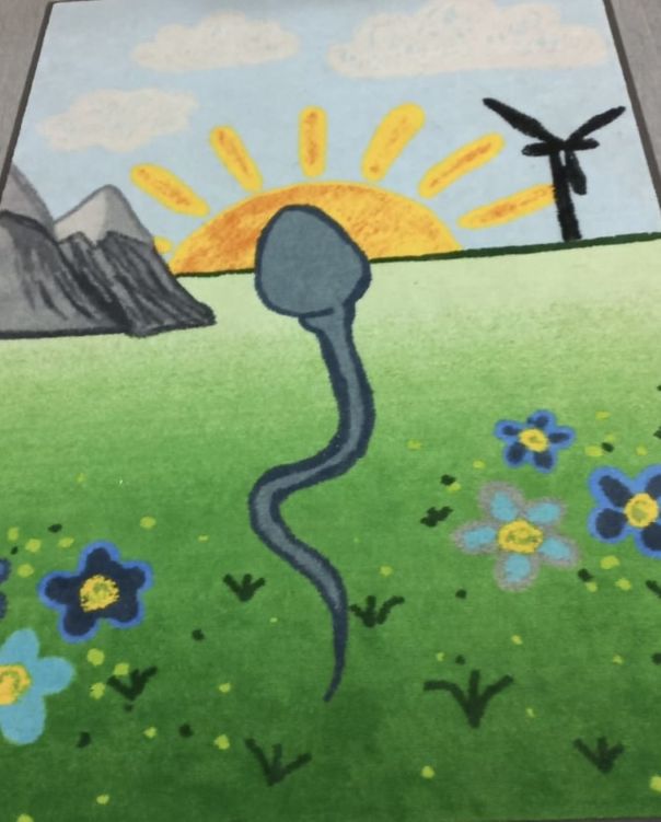 Toisessa kuvassa on nuorisotalomme uusi lattiamatto, jonka ovat yläkoululaiset koulunuorisotyöntekijän osallistamana suunnitelleet. Sen nimi on ”Siittiösolumaisema”.